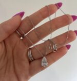 Turn heads and capture hearts with this 2 Carat Pear Cut Moissanite Necklace in radiant white. Suspended on a sleek 40 cm chain, the tear-drop shape elongates the neckline and adds an air of sophistication to any look. Whether you’re stepping into a boardroom or a black-tie event, this necklace commands attention with its perfect blend of bold sparkle and refined charm.